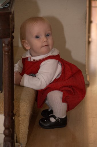 This shot just looked like pure mischief and I had to throw it in. Hope has mastered climbing up the stairs - though not climbing down. We think she's real close to taking her first steps - she's doing real well at pulling herself up on things and using furniture to walk along and even turning around and grabbing another support method...just not venturing those solo steps.